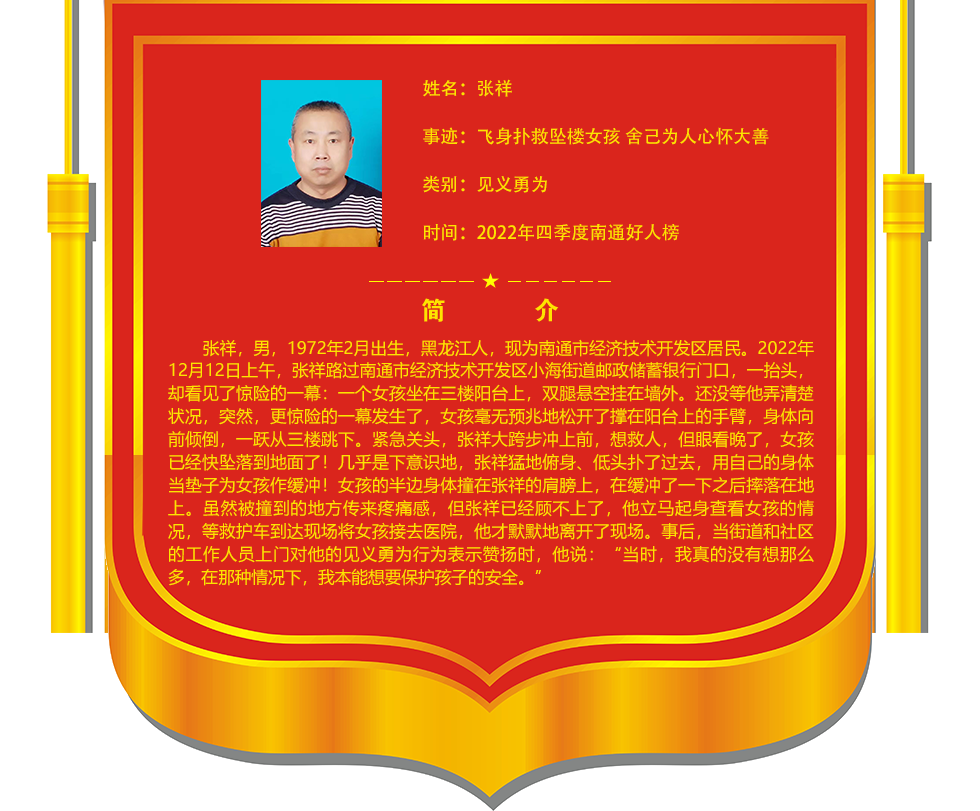 张祥,男,1972年出生在黑龙江的一个小镇上,2012年来到南通市经济技术开发区小海街道安家就业,成为了一名“新小海人”。生活中他尊老爱幼、家庭和睦,工作中他兢兢业业、待人友善,身边人都夸赞他有一副“热心肠”。尤其是2022年12月他的“飞身一扑”,书写了“凡人英雄”的最美篇章。
