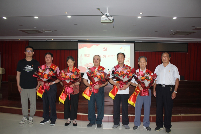 崇川经济开发区事业单位退休老干部党支部书记解建达、明星社区党委书记王建春为入党50年的黄兰英、汤银宝、徐汉明、范进成颁发了“光荣在党50年”纪念章,为他们佩戴绶带、献上鲜花。现场响起热烈的掌声。黄兰英在发言中回顾了自己入党以来,学习、工作上的点点滴滴,分享自己的“初心故事”,表示要不忘初心,牢记使命,继续听党的话,永远跟党走。
