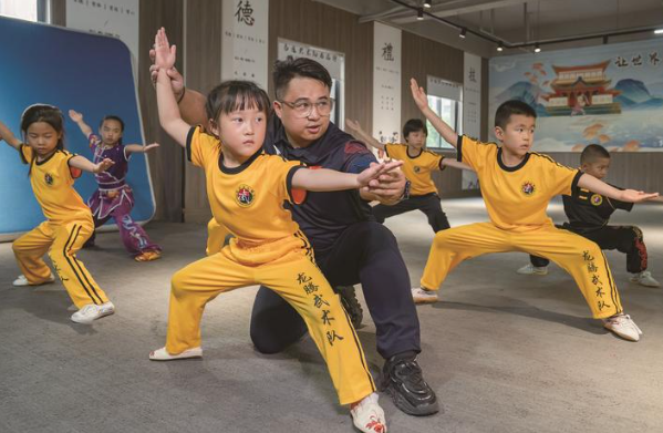 15日,海安城区一武术培训机构内,孩子们在老师指导下练习武术。暑假期间,不少孩子前来学习武术,增强体质。
