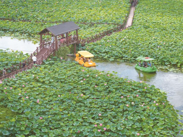 19日,游客在如皋市平园池村千亩藕池文化园赏荷游览。近年来,平园池村积极打造荷藕产业链条和荷乡旅游品牌,获评中国美丽休闲乡村、全国乡村治理示范村、全国文明村等。