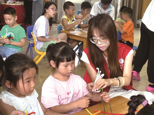 21日,陈桥街道丽都社区联合南通大学机械学院开展少数民族习俗科普活动,志愿者和丽都社区的孩子们一起DIY民族头饰。