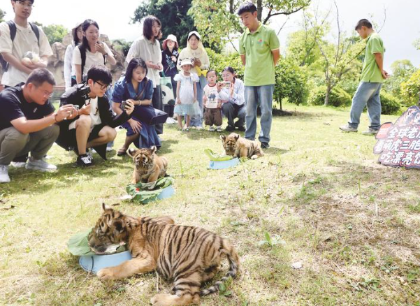 28日,南通森林野生动物园开展了“东北虎三胞胎成长首秀”主题活动,现场进行了幼虎进食、体检及互动等环节,为游客呈现了一场充满自然野趣的成长观察体验,迎接“全球老虎日”的到来。