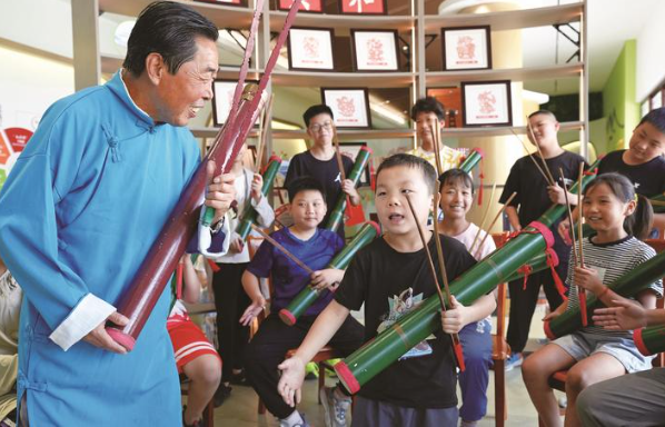 28日,海安市墩头镇毛庄村,公益暑托班的学生在当地文化志愿者指导下体验非遗道情技艺,感受中华传统文化的魅力,丰富假期生活。