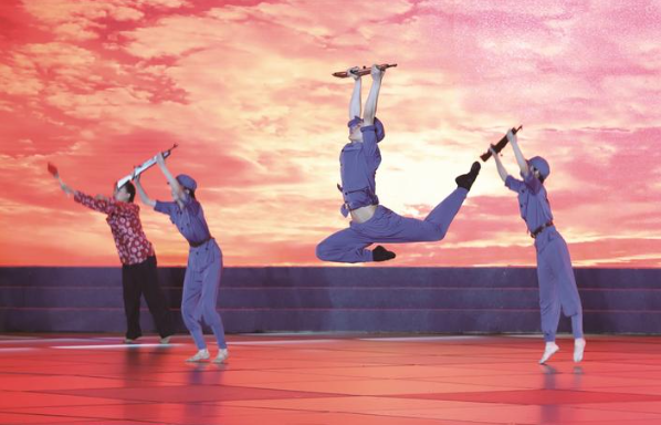 1日晚,庆祝中国人民解放军建军98周年暨八一双拥晚会在“濠滨夏夜”舞台上演。晚会以“江海铭记历史 同心共筑和平”为主题,在烽火峥嵘、薪火相传、潮涌江海三个篇章里,展现江海大地上一曲曲军民鱼水情深的壮丽凯歌。现场市民和受邀而来的现役、退役军人们一起,同庆建军节,共话军民情。图为舞蹈《映天红》的演出场景。