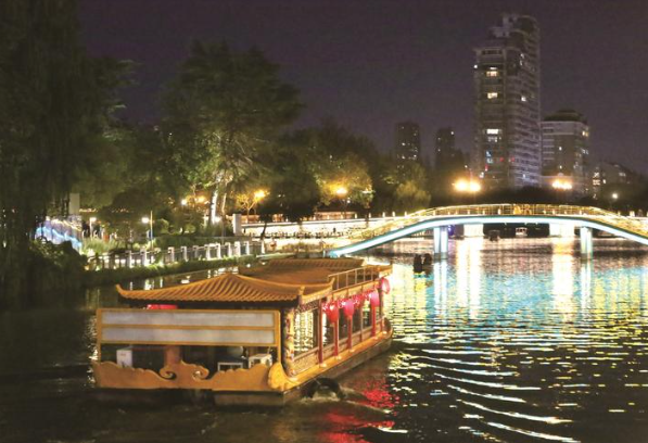 4日晚,游客乘坐画舫畅游濠河,欣赏流光溢彩的夜景。记者从南通濠河旅游园景建设有限公司获悉,1~7月,该公司大型游船共接待游客近6万人次。