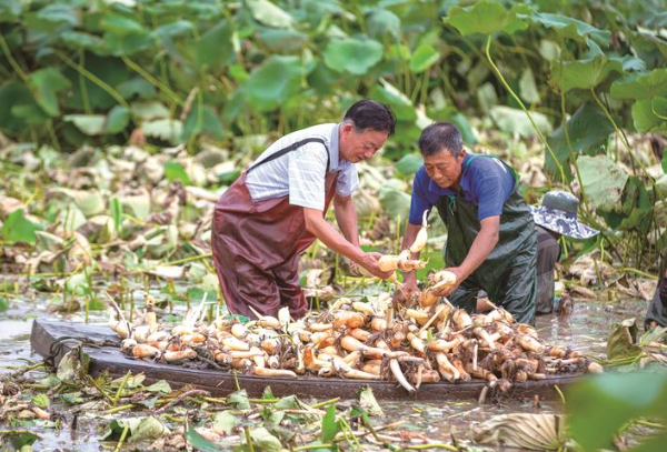 6日,通州区东社镇庆丰社区的农民在藕塘里采收莲藕。立秋将至,生态莲藕迎来采收季,当地农民抢抓农时采收莲藕供应市场,呈现出一派繁忙收获的景象。