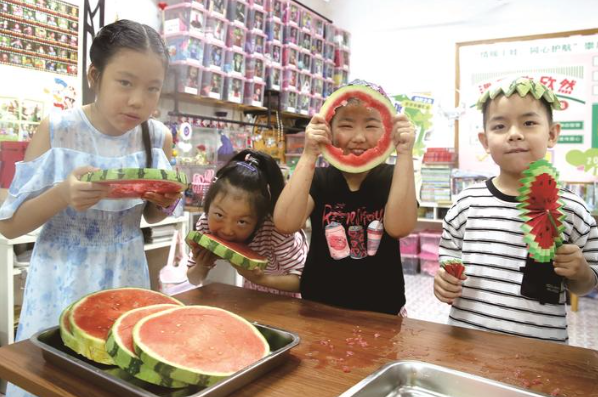 6日,“崇德”爱心暑托班(新城桥班)在红书房举办“啃秋”迎立秋主题活动,欣欣然志愿者讲解立秋习俗和西瓜科普知识,劳模和同学们开展了别开生面的吃西瓜“啃秋”比赛,学做折纸西瓜扇子。
