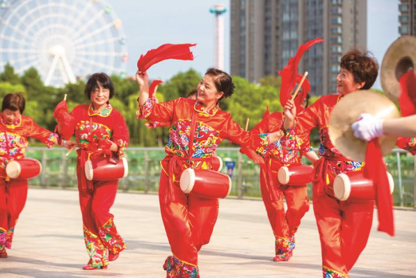 8日,南通市通州区金新街道的舞蹈爱好者在南山湖公园打腰鼓。当日是我国第17个“全民健身日”,我市各地开展了丰富多彩的全民健身活动,众多市民走出家门,前往公园、绿地、体育场馆等处尽享运动快乐,拥抱健康生活。