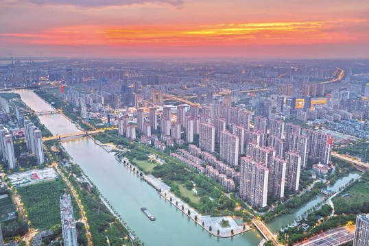 6日在崇川区拍摄的通吕运河和美丽晚霞。通吕运河是江苏著名通航运河,外通长江,是南通内河运输的主要河道,被称为南通“第一运河”。