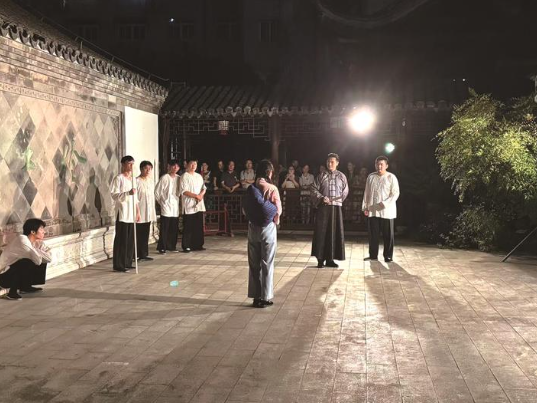 照壁前,少年“投社学艺”;两棵古银杏树下,新旧办学理念激烈碰撞,展开“办学之争”;三号展厅前,学员上演“斗剑惊险”;而在露天戏台前,“克难前行”“堂会辨师”“棠梨花开”三幕接连上演,讲述了在学社经费短缺之际,欧阳予倩先生为保住学社,忍痛违背“不唱堂会”原则,赴富商顾鸿泰家筹款的故事。一步一景一情节的沉浸式演绎,给观众带来耳目一新的观剧体验。