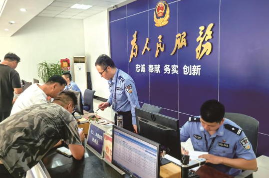 8日,民辅警在服务大厅为办事群众细致服务。南通市公安局交通管理支队四大队以“互联网+”思维方式创新工作机制,适应大数据时代的新要求,主动理清所有办事项目和办事程序,大力宣传“交管12123”App,提高群众“学法免罚”和“学法减分”等多项便民举措知晓率,推进“网上办、掌上办”,实行一次性告知,避免群众二次跑腿。