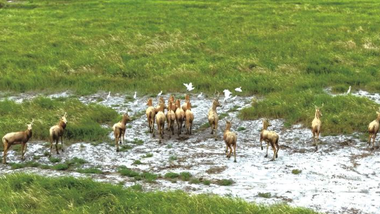 11日在如东小洋口风景区拍到的野生麋鹿群。2023年2月,如东地区首次出现成群的野生麋鹿。2年多后,麋鹿群的数量已从最初的30余头增长至目前的上百头。