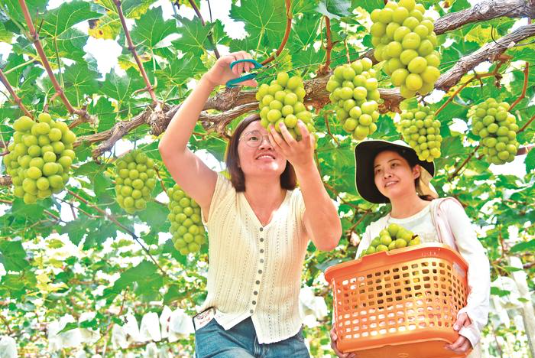 11日,如皋市长江镇永平闸社区葡萄种植园喜获丰收,吸引游客前来采摘。近年来,如皋市长江镇大力发展特色果品产业,积极探索“基地+旅游+采摘”的农文旅融合路径,带火乡村产业发展,实现强村富民。
