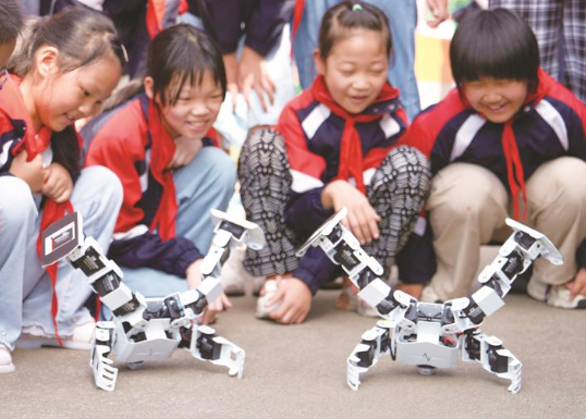 17日,海安市墩头镇吉庆小学学生正在观看机器人表演。当天,该校开展“科学趣体验”校园科技节主题活动,通过科普讲解、互动体验等方式,让学生零距离“触摸”科技的神奇。