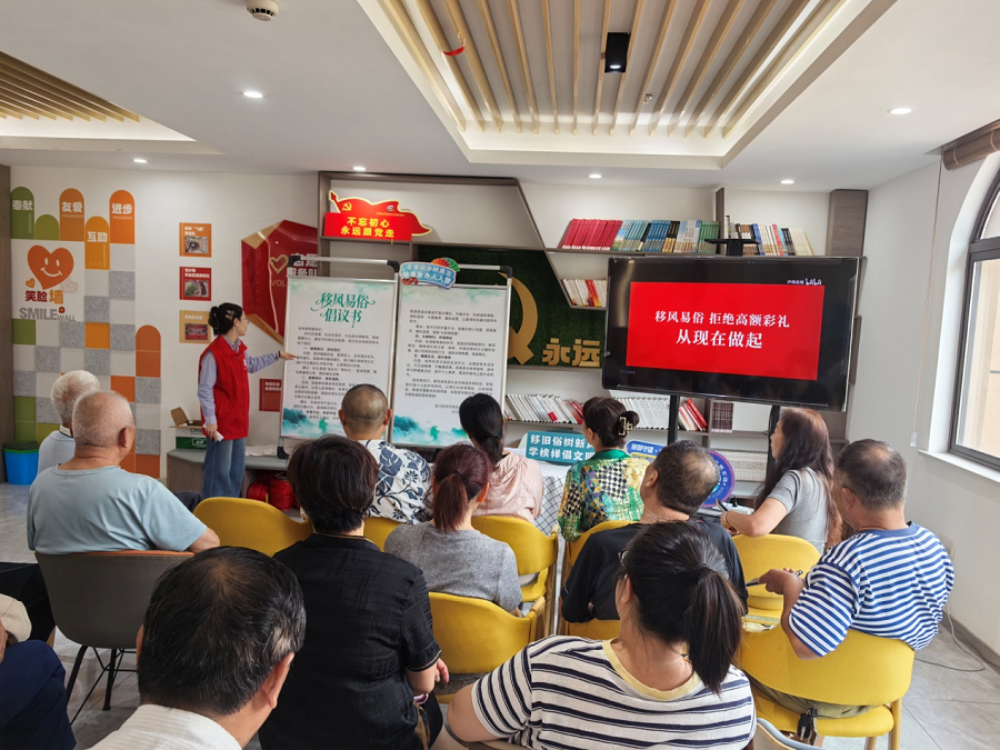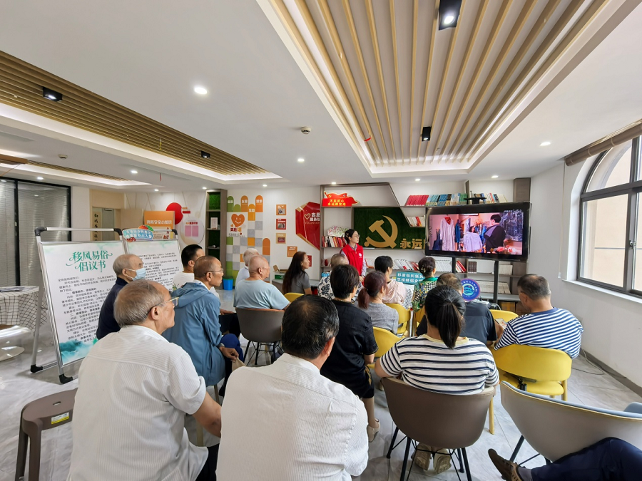 观视频析危害,摒弃婚嫁陋俗。活动伊始,党员、居民们集体观看了移风易俗主题宣传教育视频《礼轻情重》。该视频聚焦当前社会特别是婚嫁领域中存在的攀比铺张、大操大办、高额彩礼等不良现象,通过生动的案例和质朴的语言,深刻揭示了这些陈规陋习给家庭带来的沉重经济负担、给年轻人造成的巨大精神压力,以及对淳朴社会风气的侵蚀。通过视频进一步引导大家思考“情义”与“礼金”的本真关系,倡导“礼轻情意重”的健康交往理念。观看结束后,社区志愿者结合视频内容与现实生活中的实例,进一步为大家剖析陈规陋习的深层危害,讲解移风易俗对于促进家庭和睦、社会和谐的必要性和紧迫性,帮助大家从思想根源上认识到摒弃旧俗、拥抱新风的重要性。
