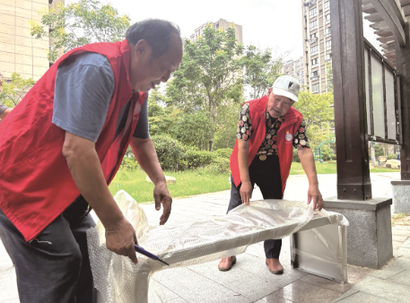 23日,在兴石花园三期,崇川经济开发区朝东埭社区的老干部志愿者联合施工人员开展便民椅安装活动,为居民提供了更多休息的地方。